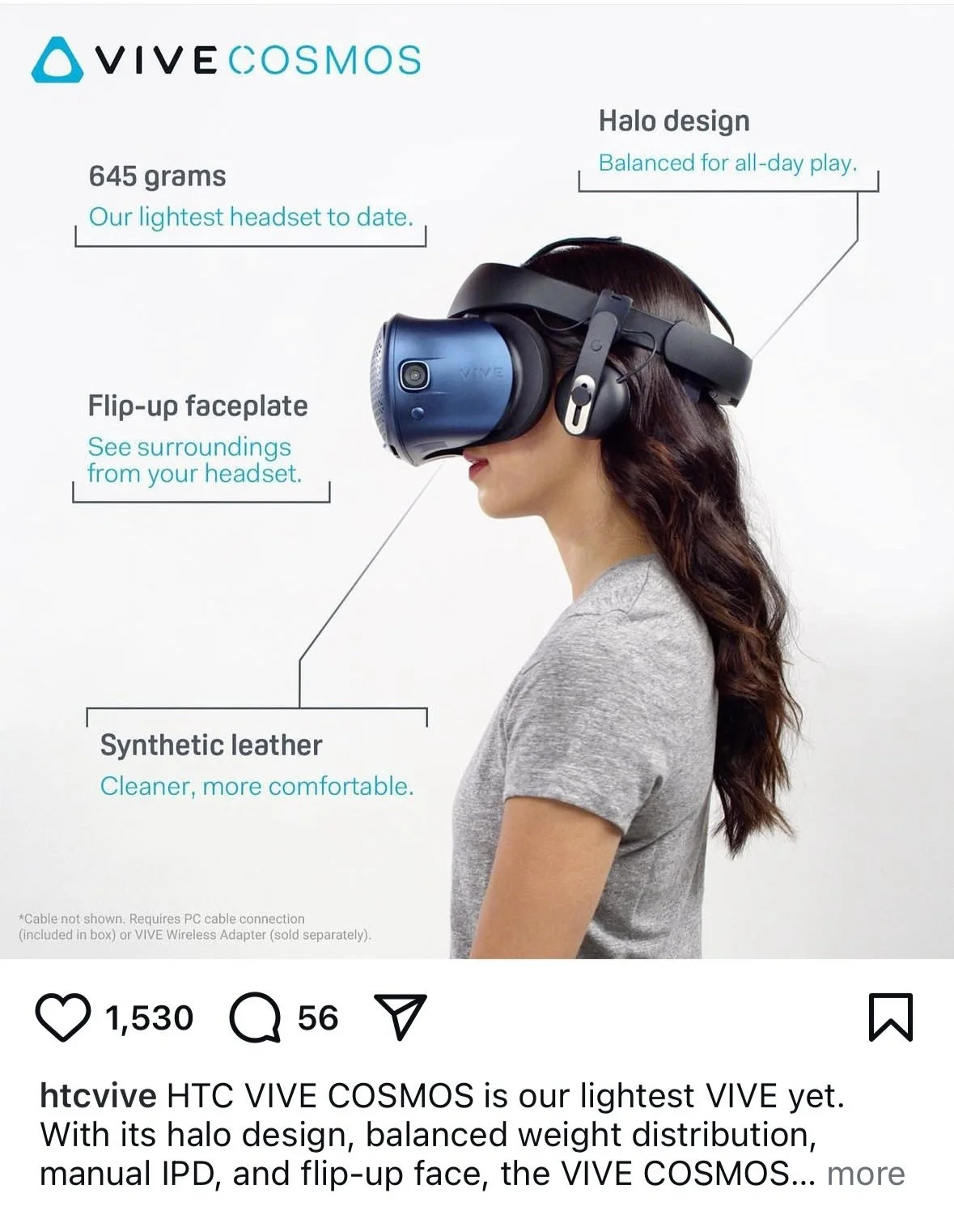 30 days prior to street date of VIVE Cosmos, I crafted a series of content that ran across paid media, owned social/site, and press, designed to alert the community of the upcoming launch of VIVE Cosmos. In addition to announcement messaging, I used social listening to create content to proactively address the major product topics coming from the VR community.